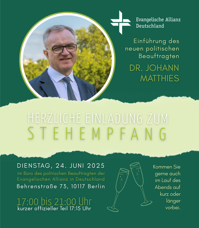 Es ist uns eine große Freude Dr. Johann Matthies am Dienstag, den 24. Juni 2025, als Nachfolger von Frank Heinrich in das Amt des Beauftragten am Sitz des Deutschen Bundestages und der Bundesregierung der Evangelischen Allianz in Deutschland e.V. einsetzen zu können. Dies werden wir im Rahmen eines Stehempfangs im Berliner Büro gebührend feiern.